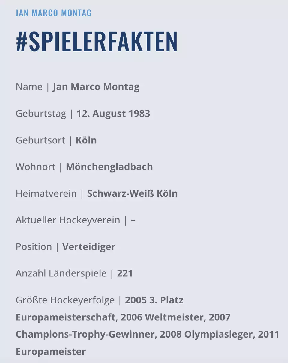 „In der Niederlage lernt man den Charakter eines Menschen kennen!“ - Ihm wurde der Hockeysport, wie vielen anderen Hockeyspieler der Gladbacher Talentschmiede, in die Wiege gelegt. Jan Marco Montag begann jedoch seine Hockey-Karriere nicht beim GHTC, wo er zwischen 2003 und 2008 spielte, sondern beim Schwarz-Weiß Köln. Er spielte sogar zweitweise in England bei den Old Loughtonians und in Spanien beim FC Barcelona. 2014 nahm er dann auch das Amt des Spielertrainers an. Letztes Jahr legte er seine aktive Spielerlaufbahn und sein Traineramt nieder. Mittlerweile ist er erfolgreicher Geschäftsführer zweier Sportmarken.