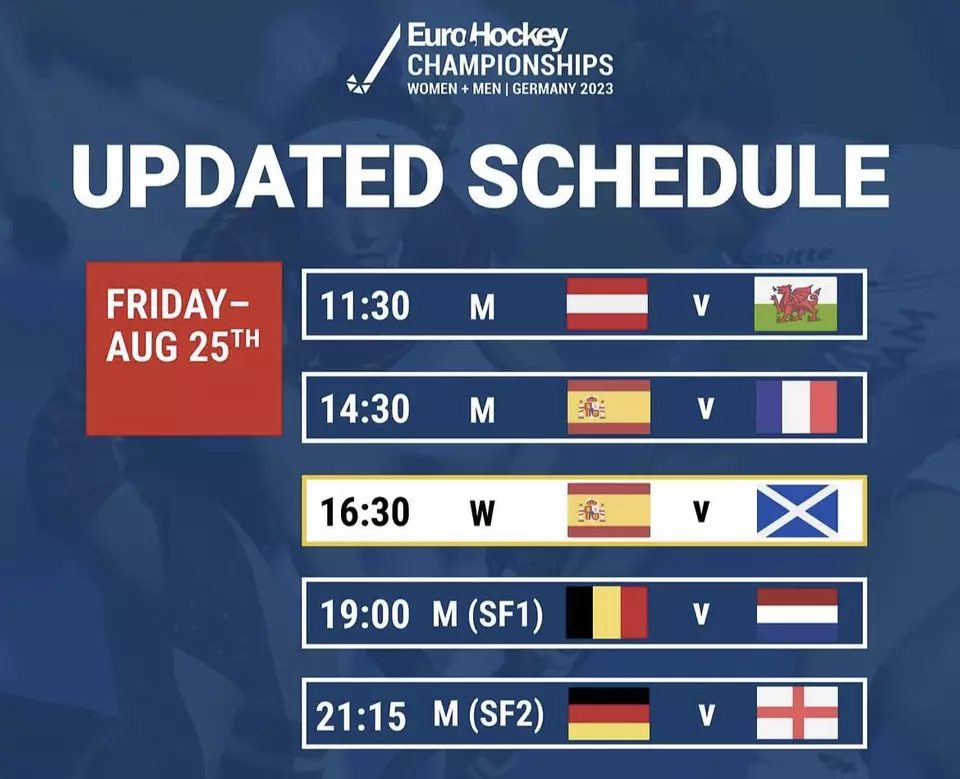 Aufgrund eines Unwetters am Freitagvormittag (25.08.2023) gibt es eine Spielplanänderung. Die Spiele des Tages werden nach hinten verschoben. Das erste Halbfinale findet statt 18:30, um 19:00 Uhr statt. Das deutsche Halbfinale verschiebt sich um eine Viertelstunde nach hinten. Das Spiel Irland gegen Italien in der Gruppe C der Damen wird auf den Folgetag (26.08.2023, 10:00 Uhr) verschoben, wodurch das Spiel Spanien gegen Wales in der Gruppe C der Herren am Samstag später stattfinden wird. Die neue Anstoßzeit des Spiels ist Samstag (26.08.2023) nach dem Damenfinale um 18:15 Uhr.