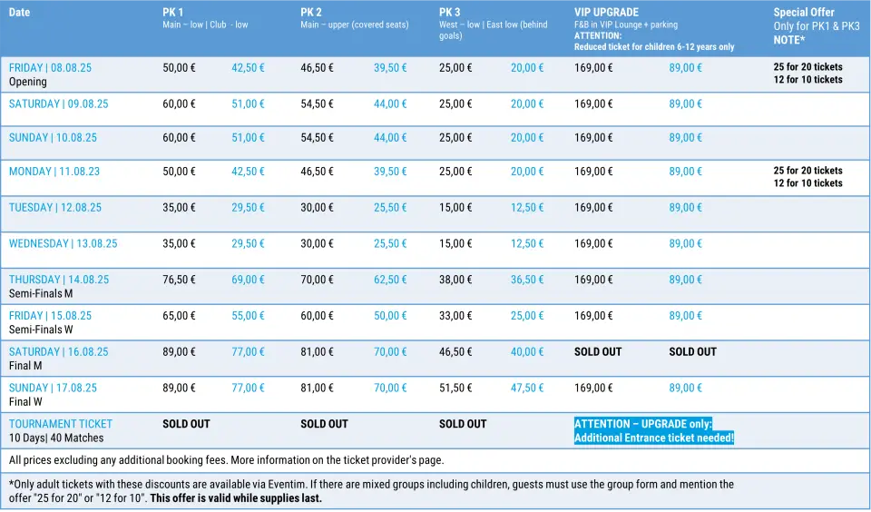 Fans can purchase day tickets for the European Championships and watch several matches live each day. The cheapest ticket in price category 3 is available from just €12.50. For a very special experience, we also have a VIP upgrade for you. VIP upgrades include food and a selection of drinks in our lounge as well as free parking. A ticket is also required for access and a seat in the stadium for VIP upgrade holders.