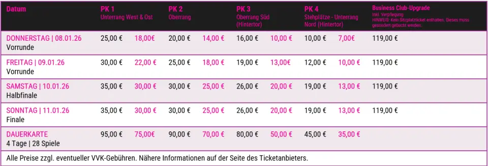 Am 08.01.2026 zahlt ihr als Gruppe von 20 Personen in PK2 280€, PK3 200€ und in PK4 140€. Am 09.01.2026 zahlt die 20er Gruppe in PK2 360€, in PK3 260€ und in PK4 200€.